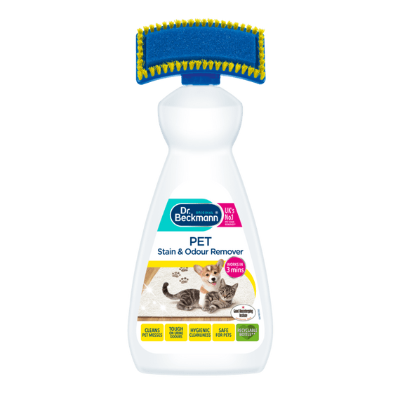 Dr. Beckmann Pet Stain & Odour Remover effectively removes stains and odours caused by pets from carpets and upholstery. The unique 2 in 1 brush applicator not only cleans surface stains (sponge) but also gets deep into the carpet fibres (bristles) leaving carpets and upholstery clean and odour free.