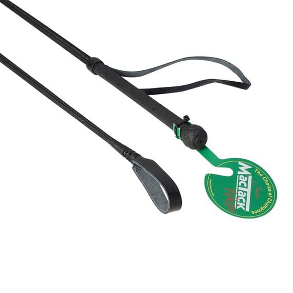 Junior riding whip, 24" coloured woven fabric stock with corresponding rubber handle and black leather wrist loop and keeper.